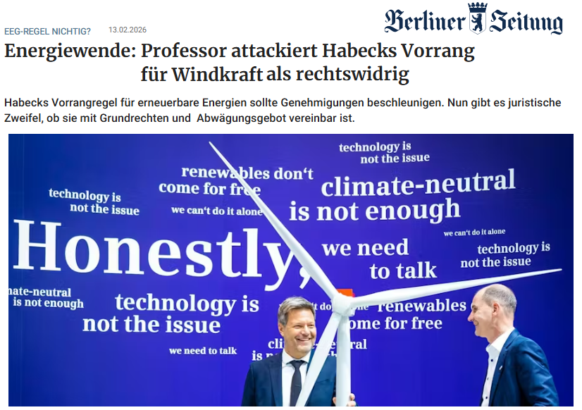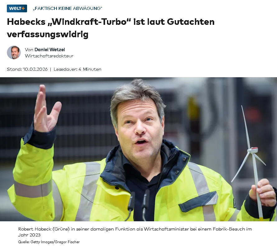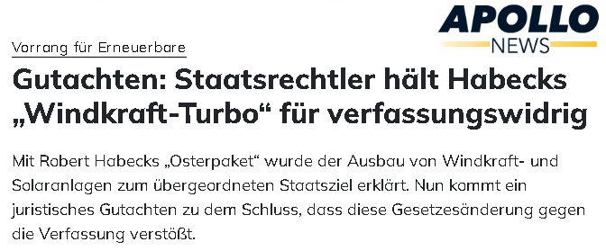 Mit der Übernahme des zustän­di­gen Minis­te­ri­ums durch Robert Habeck (Grüne) folgten jedoch weitere einschnei­dende Maßnah­men zur Privi­le­gie­rung der Windkraft. Auf maßgeb­li­ches Betrei­ben des Grünen Staats­se­kre­tärs wurde das relevante Europa­recht entspre­chend geändert und eine verschärfte Form des “Treppen­wit­zes” in Geset­zes­form gegos­sen: Mit dem Konstrukt eines “überra­gen­den öffent­li­chen Inter­es­ses” wird Windkraft­vor­ha­ben ein Vorrang beschert.